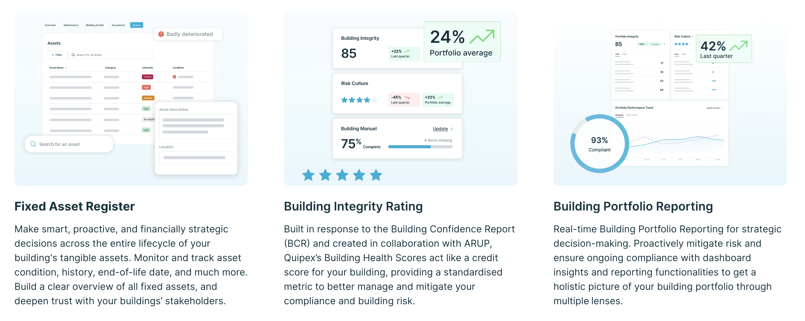 At the core of the platform are Quipex’s bespoke Building Integrity and Risk Culture scores, which provide a living snapshot of each building’s risk profile. Validated by an industry-leading fire engineering firm, these scores measure proactive safety, compliance, and risk management across both individual buildings and entire portfolios, tracking both the status of compliance and the cultural trends that shape long-term risk outcomes.