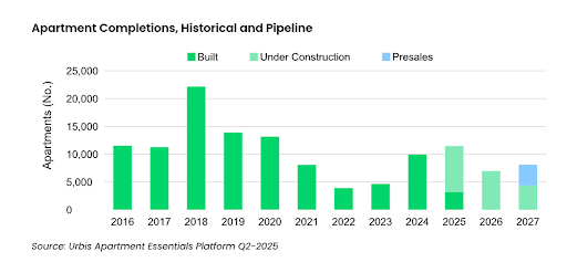 Meanwhile, Sydney continues to face a major undersupply of apartments. The NSW Government has set ambitious housing targets, but current forecasts fall well short. Urbis completion data highlights how deeply the pandemic disrupted construction, with 2025 likely to deliver completions on par with 2020. Looking ahead, completions expected in 2026 could dip back to just over 6,000 apartments, almost half the level expected in 2025.