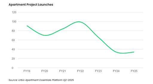 A lack of new project launches is also feeding the undersupply, with many developers exiting the market or delaying starts until conditions improve. There were just 34 project launches in the Sydney Essentials Region in FY25. While that reflects some stabilisation following a steep decline, it is still well below the 70–100 launches per year recorded between FY19 and FY22.